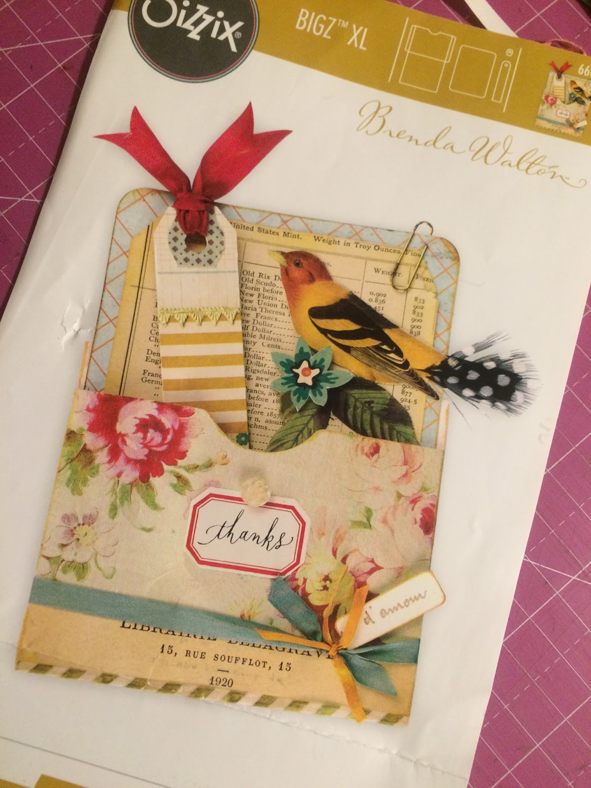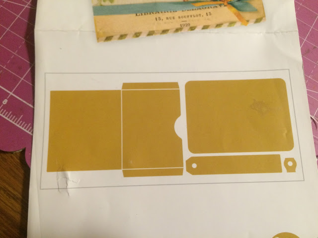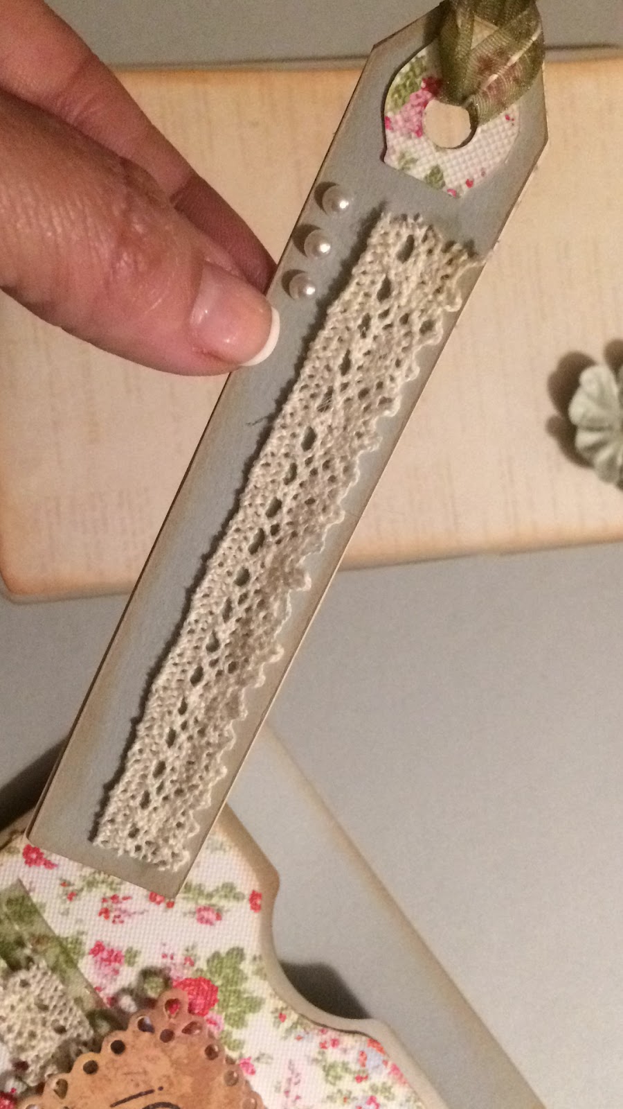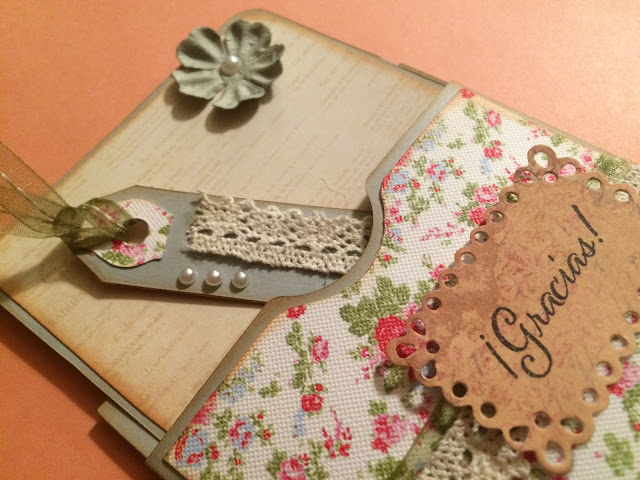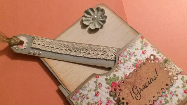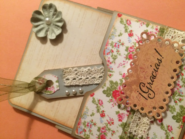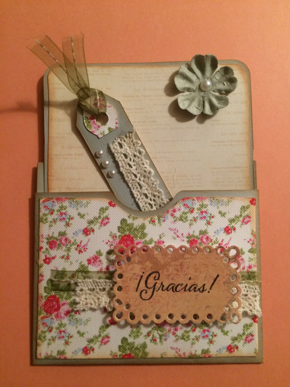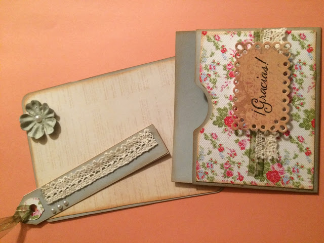 *** es compuesta de 3 partes, cada cuál decorada a gusto. A mi me gustan las capas de papel, el envejecimiento, los detalles pequeños coordinados. Las tres partes son: el sobre/bolsillo (que se ve en diagrama para doblar), el tarjetón que puede ser para escribir una nota o foto, y en este caso, un marca-página que viene el el die cut. Este añade un nuevo elemento de decoración. Como os he dicho, en su lugar o además de ello, puedes poner dinero, tarjeta regalo, un pequeño regalo como un anillo, etc.