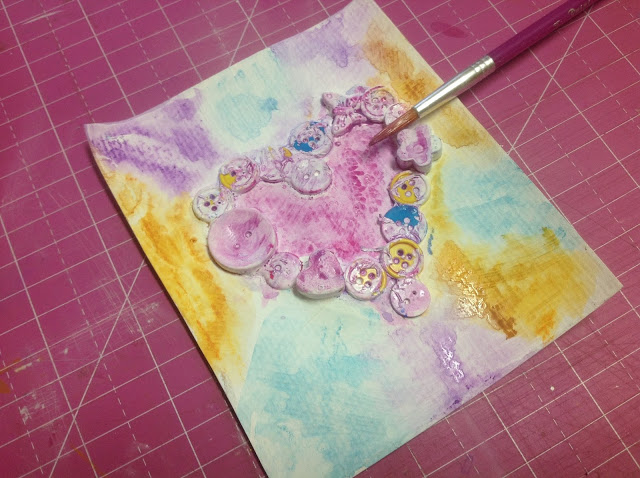 Cubrir todo los botones y el papel con geso. Dejar secar completamente.