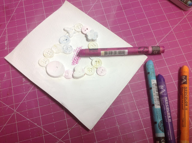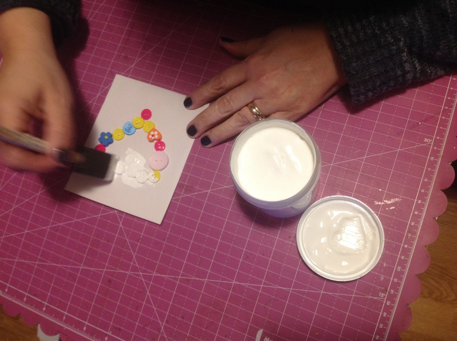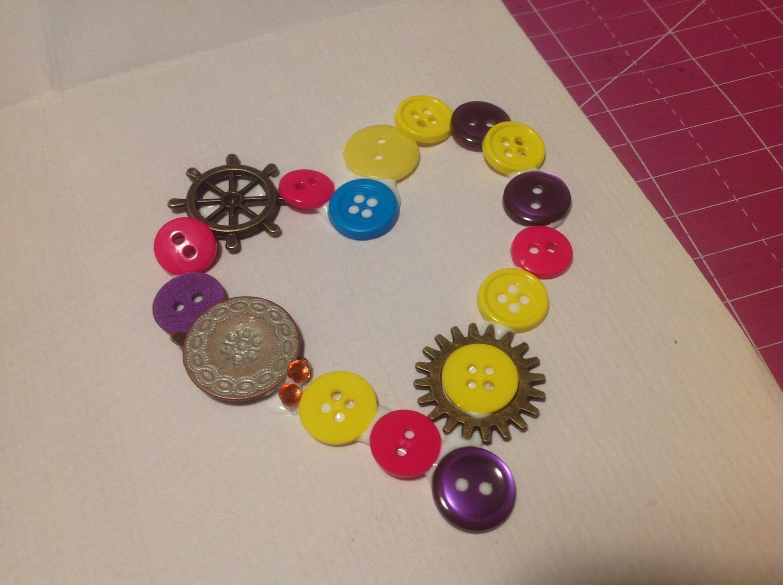 Disponer los botones en la forma que quieras. Yo elegí ¡CORAZONES! Pegarlo con cola blanca. Dejar secar completamente.