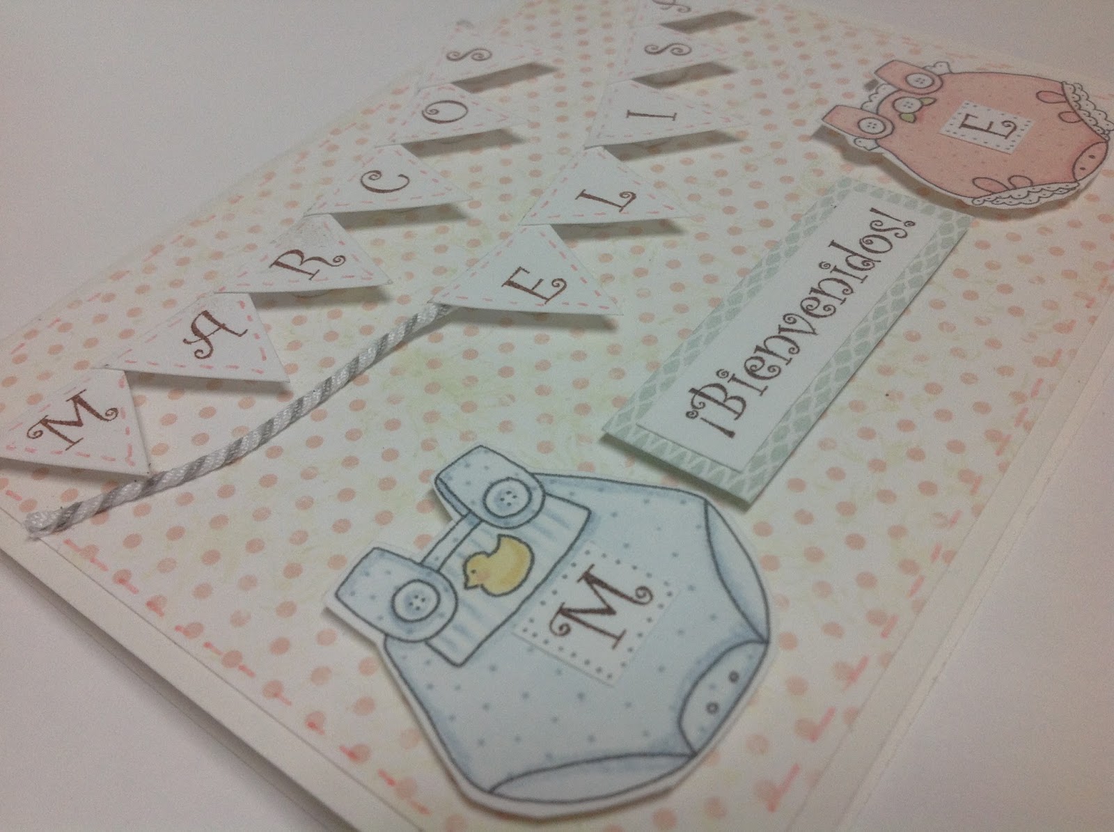 He imprimido estas ropitas tan monas. He imprimido las letras con el ordenador y he cortado todas las letras en forma de banderolas. Mirad el detalle de las iniciales en las ropas.
