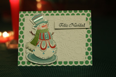 Tenía esta simpática pegatina de hombre de nieve de hace un tiempo. Los colores eran ideales para esta tarjeta de lunares. He pasado una hoja blanca por la Big Shot para dar relieve de copos de nieve. El saludo está sobrepuesto con almohadilla de relieve. Sencilla y festiva.