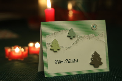 Tenía estos arbolitos de madera de hace unos años. He rasgado un trozo de papel blanco en dos y los he sobrepuesto en forma de montañas de nieve. Con Stickles he aplicado el color plateado con el dedo para que fuera más natural, tanto en la montaña como en los arbolitos. El brillo suave añade mucho a esta sencilla tarjeta.