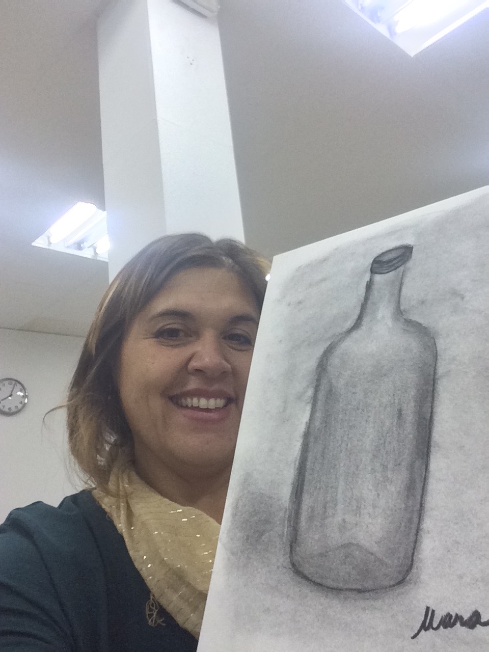 Es muy interesante cómo objetos pueden ayudarnos a crear pequeñas obras de arte. De acuerdo con Greg, el objeto tiene que «hablar» con nosotras antes de que lo podamos dibujar. Hay que tocarlos con los ojos cerrados y «sentir» el objeto. Hemos hecho este ejercicio al sonido de bonitas obras clásicas.