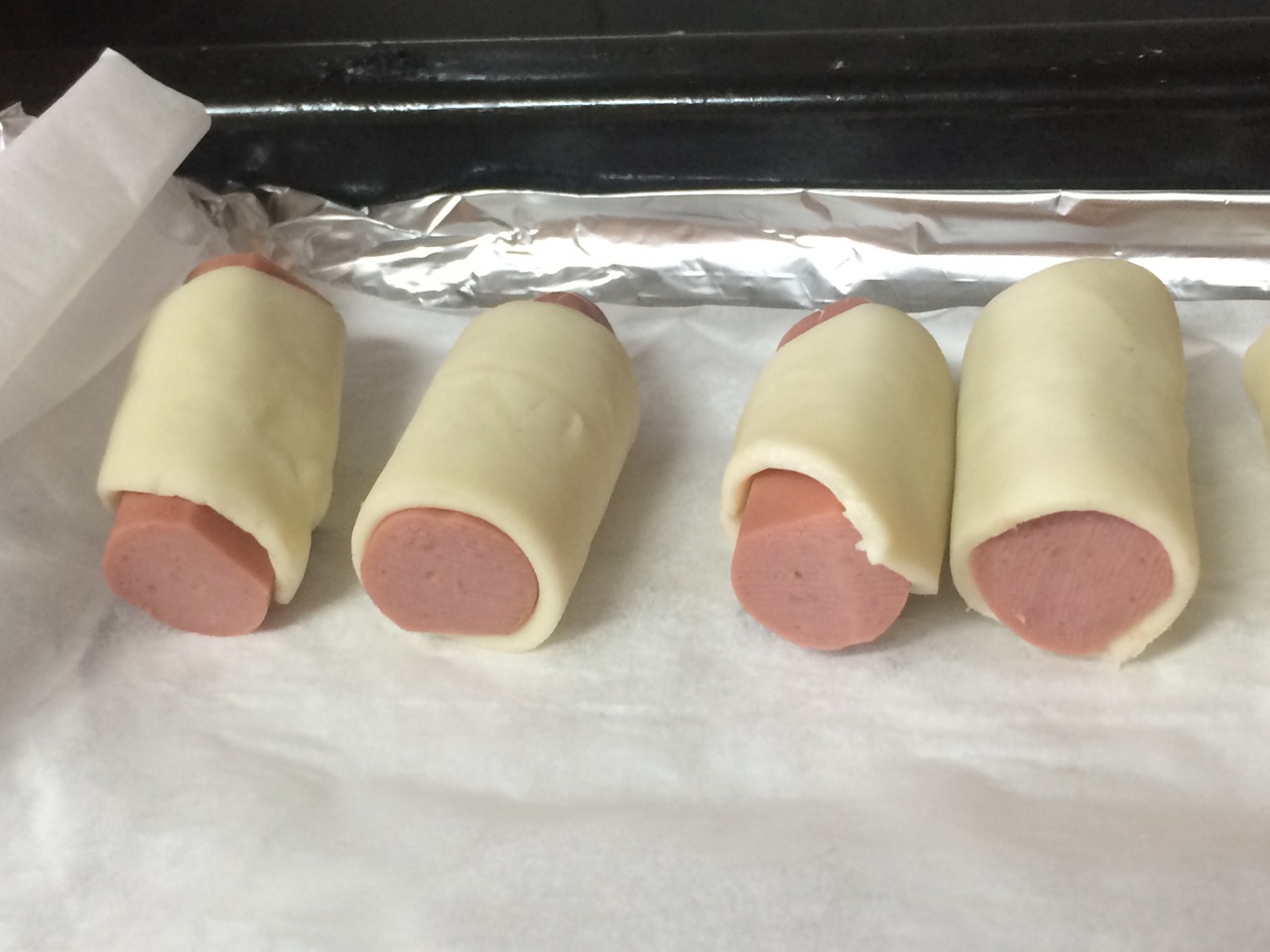 Se corta la masa de hojaldre en pequeñas «mantitas» y enrollas las salchichas con ella.