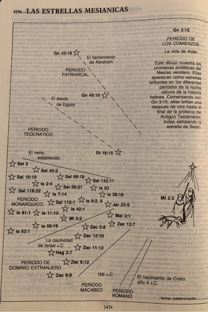 Este dibujo muestra las promesas proféticas del Mesías venidero. Ellas aparecían como estrellas brillantes en los diferentes períodos de la noche oscura de la historia hebrea. Comenzando con Génesis 3:5, ellas brillan una después de otra hasta el final de la profecía del Antiguo Testamento, todas señalando la estrella de Belén.