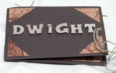 Infelizmente no tengo más fotos, no pudiendo encontrar este proyecto después de una mudanza. Abriendo el «billetero» encontrarías dos bolsillos hechos con el mismo papel de mapas (le encanta viajar). En un lado he puesto otra foto de los niños. Del otro lado he preparado 3 tags envejecidos y en cada uno los niños le escribieron mensajes.
