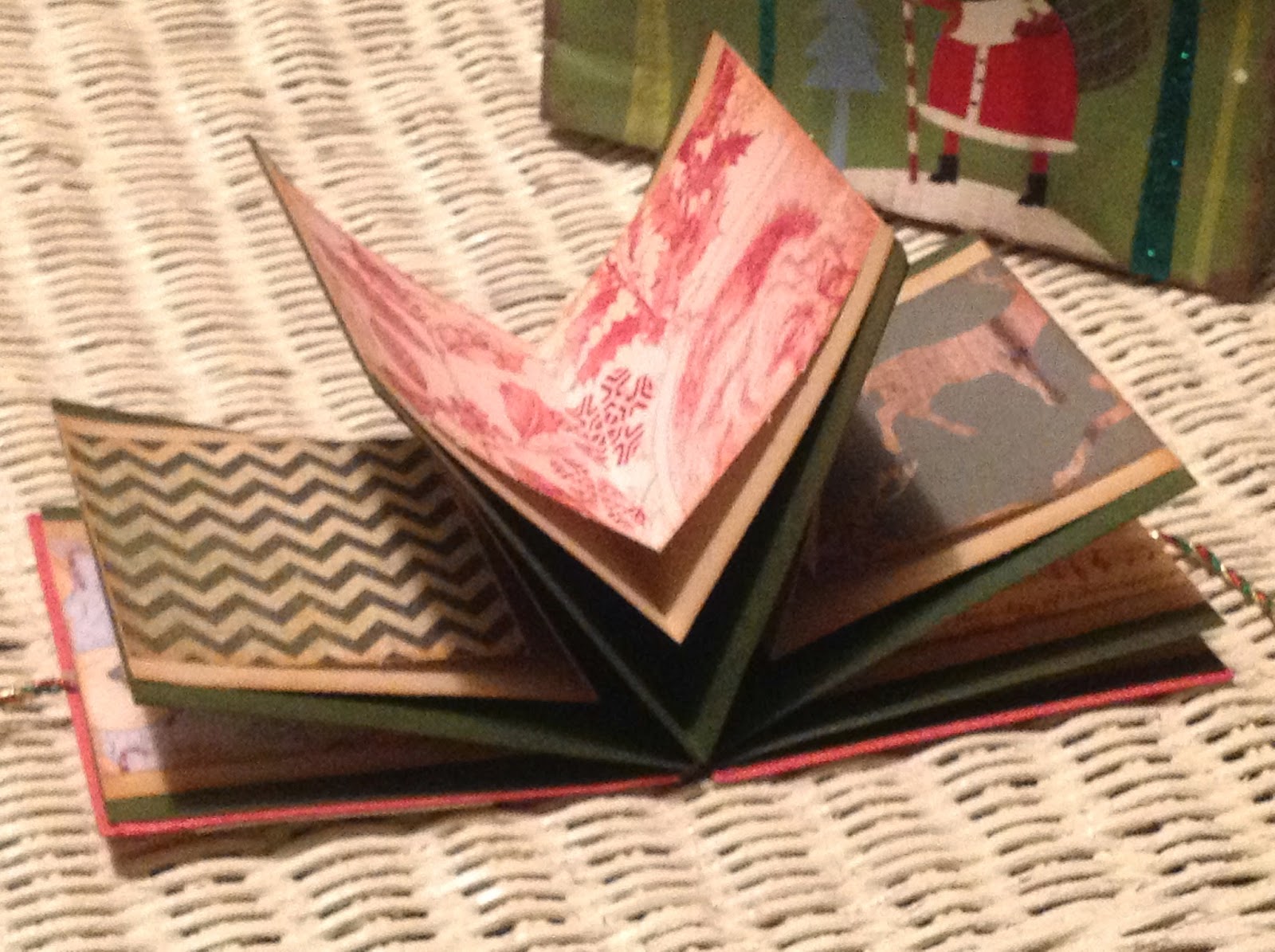 Vas a necesitar: 2 trozos de cartunila para las tapas 10×10 cms 2 trozos de papel decorativo para forrar las tapas 14×14 cms 6 rectángulos de cartulina lisa en la medida de 20×10 cms 6 rectángulos de cartulina lisa de otro color en la medida 16,5×9 cms 6 rectángulos de papel estampado navideño variado en la medida de 14×7,5 cms 2 trozos de cordón decorativo entre 35 y 40 cms cada uno Pegamento y decoraciones a gusto, aquí solo mostraremos lo básico de cómo montarlo.